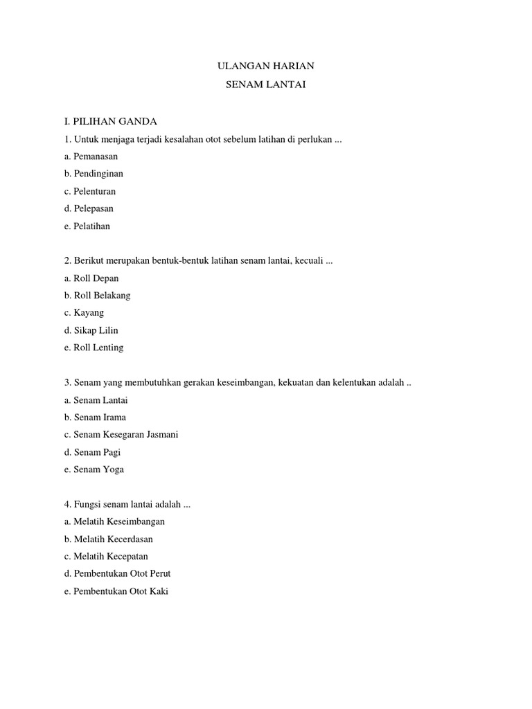 Materi Kesegaran Jasmani Kelas Ii Seberkas Cahaya Ilmu from seberkascahayailmu09.files.wordpress.com Latihan kelentukan ini juga membuat gerakan membungkuk, berjalan, dan mengangkat lebih mudah. Senam lantai memerlukan keseimbangan tubuh, flesibilitas, koordinasi yang baik, kelincahan dan kekuatan agar ketika melakukan gerakan senam tidak terjadi resiko cedera. Prinsip dasar aktivitas senam ritmik adalah adanya kelenturan tubuh di dalam melakukan c. Posisi yang membantu saat menolong gerakan guling ke 18. Senam kebugaran pada kekuatan otot lengan dan otot dada adalah. Untuk melakukan senam irama (ritmik) ada beberapa hal yang harus kita perhatikan, mulai dari keseimbangan, kelenturan, fleksibilitas, kontinuitas, ketepatan, dam keseimbangan. Keluwesan, kesinambungan gerakan, dan ketepatan irama. Senam lantai adalah salah satu disiplin dalam cabang olahraga senam yang dilakukan di lantai dengan beralaskan matras berukuran sekitar 12 meter.